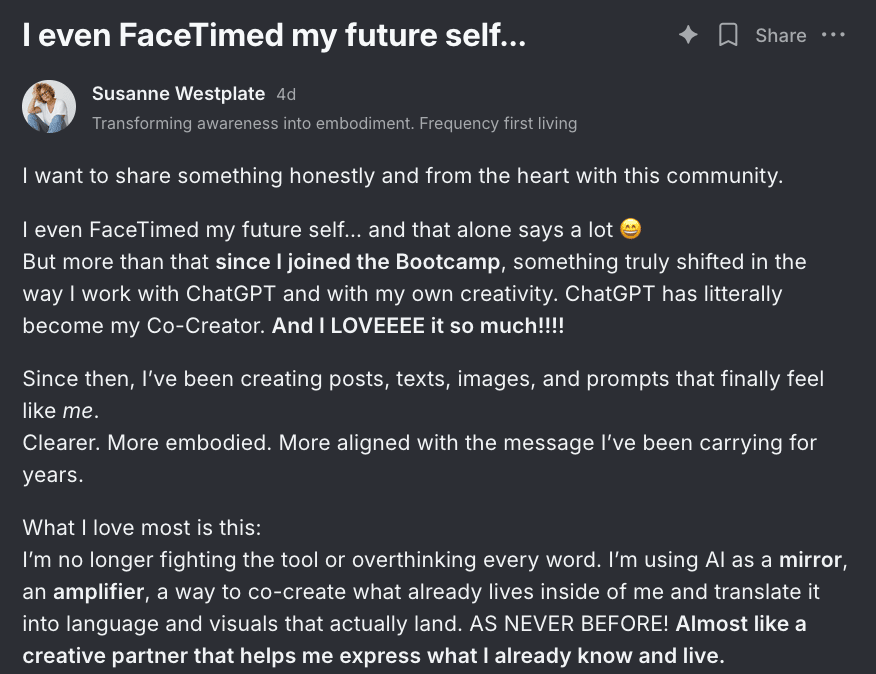 Now you can ask questions about gameplay, strategy, lore, or anything else and get the answers from your favorite character. Pro Tip: This works best in Voice Mode! You can send the initial prompt and then switch to voice mode to have your guide standing by waiting for you to ask questions aloud. This way, you can get answers about your game without taking your hands off the controller! 📽️ Video of the Week: Why Does The Seahorse Emoji Drive ChatGPT Insane? Understanding what an LLM is and what it's doing behind the scenes is critical if you want to master modern AI tools. If you want a crash course on the inner workings of an LLM like ChatGPT, check out this 5-minute video from Siliconversations.​ It showcases and subsequently breaks down the fascinating "Seahorse Effect" where asking a seemingly simple question can put ChatGPT into an endlessly spiraling loop of failure. The video teaches you why this happens, and knowledge like that is invaluable when you're working with AI. 🎤 Discussion of the Week: Creative Breakthroughs Thanks to AI This week, community member Susanne shared a heartfelt win: since joining the Bootcamp, ChatGPT has become her co-creator that helps her translate years of lived experience into posts, visuals, and messaging that finally feel clear, embodied, and unmistakably her. One of the most powerful takeaways came from the comments when someone asked for the prompt behind her images. Susanne explained there isn’t one. Her results came from an ongoing co-creation process, by layering prompts, iterating, testing, and refining across tools and reference images. AI can be a truly incredible creative partner when you learn how to guide it. The community loved this share as it's a great, concrete example of what you can accomplish with today's AI tools. ​Come join the conversation! Sign up for the AI Amplifier Club for $1 for your first 30 days.​ That's all for this week! See you next Thursday. Much Love, Follow The AI Advantage: Written By:​ |